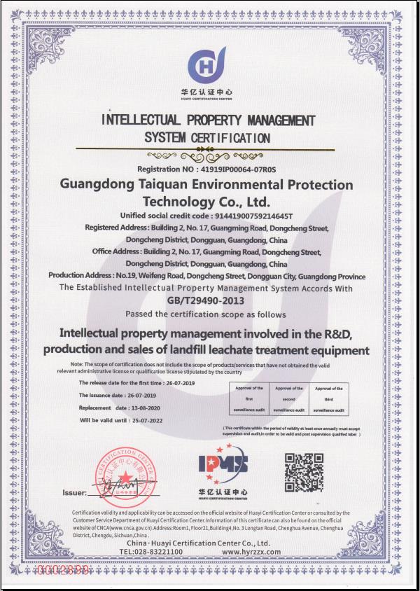 滲濾液處理設(shè)備知識產(chǎn)權(quán)管理體系認(rèn)證證書